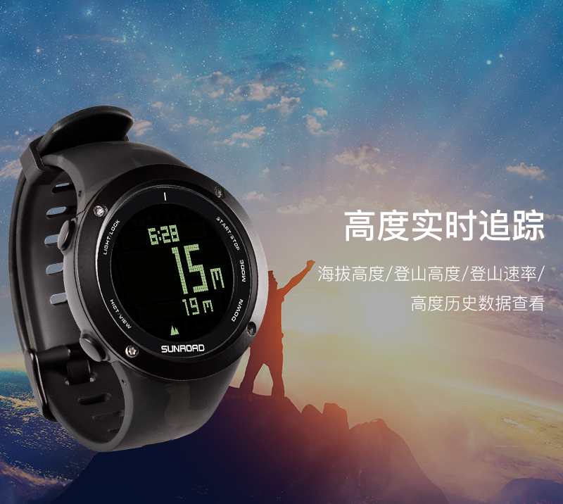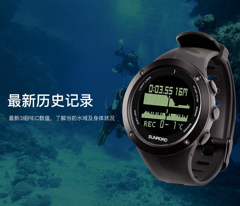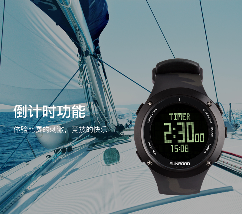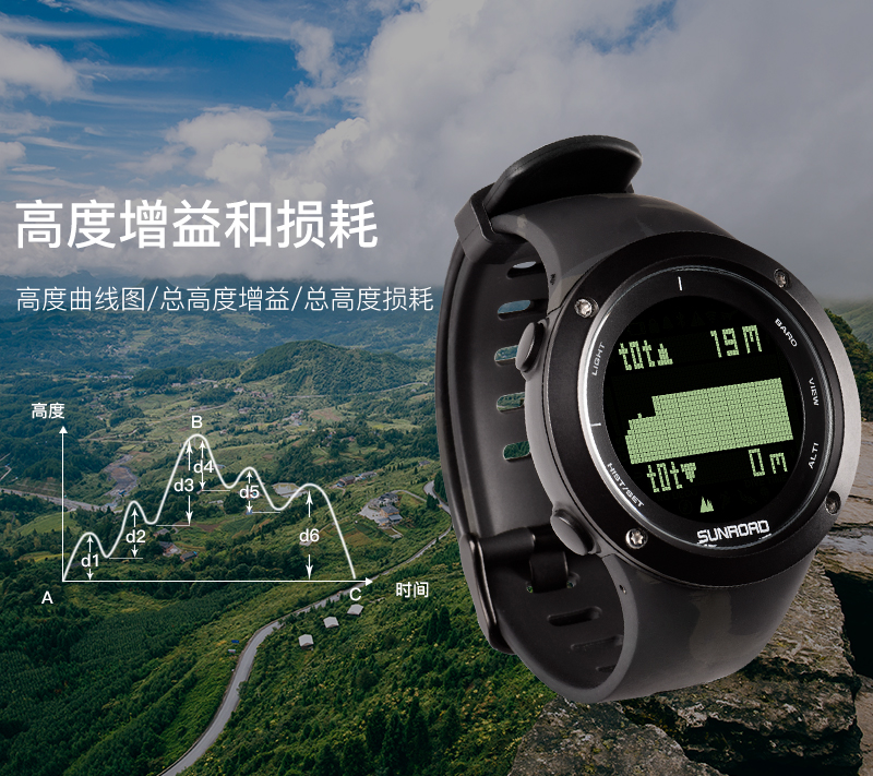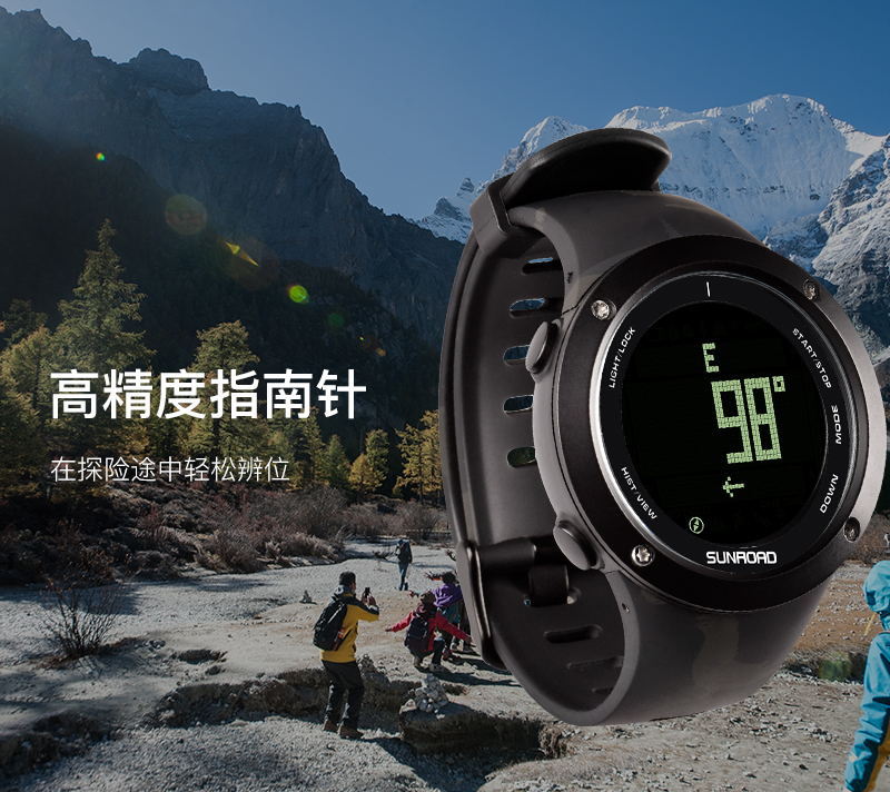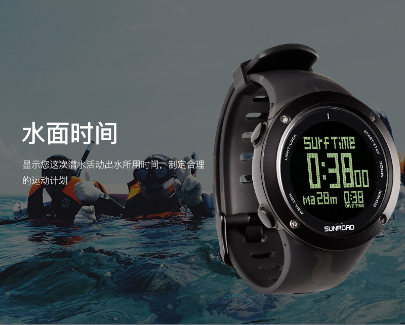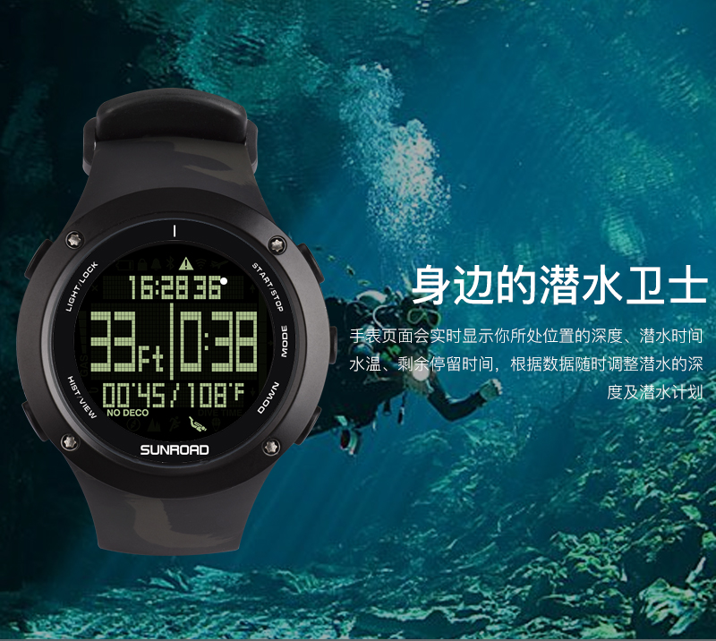 深度测量,心率测量,闹铃,罗盘功能,气压测量,GPS导航,计步,测速,防水,高度测量,湿度测量,24小时指示,计时码表,日历,温度测量,夜光,智能提醒