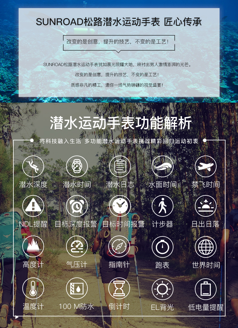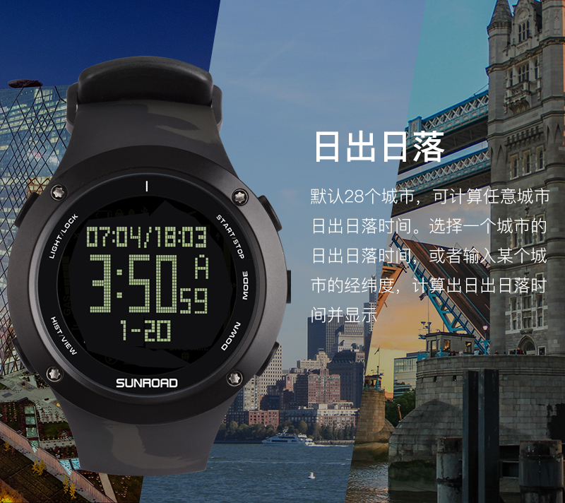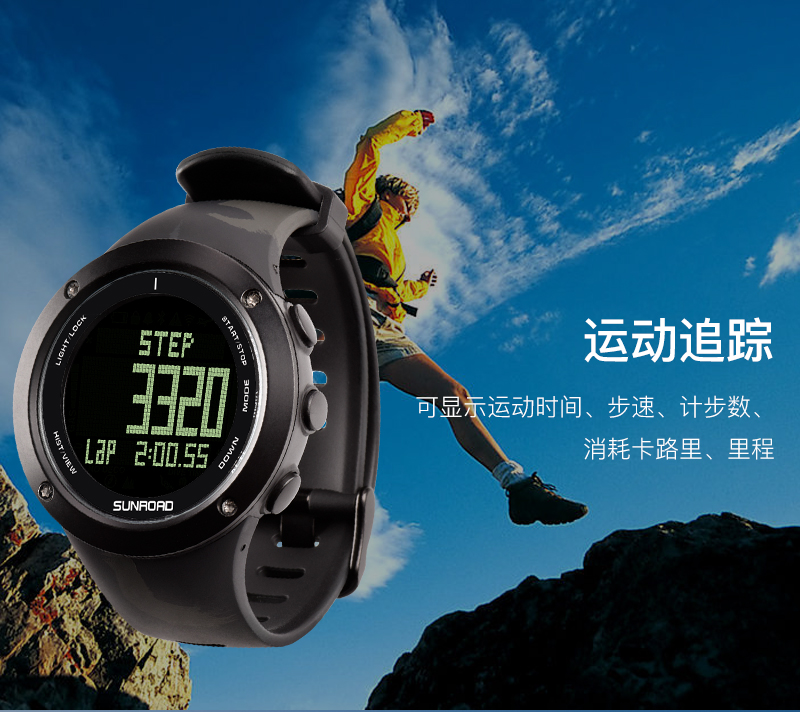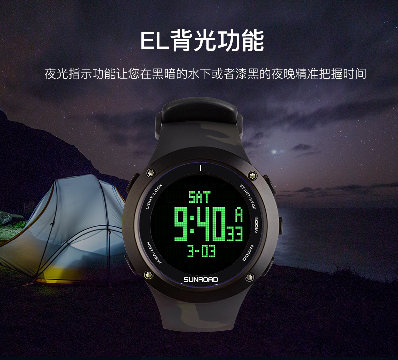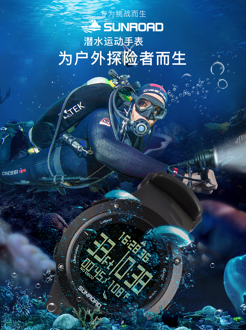 深度测量,心率测量,闹铃,罗盘功能,气压测量,GPS导航,计步,测速,防水,高度测量,湿度测量,24小时指示,计时码表,日历,温度测量,夜光,智能提醒