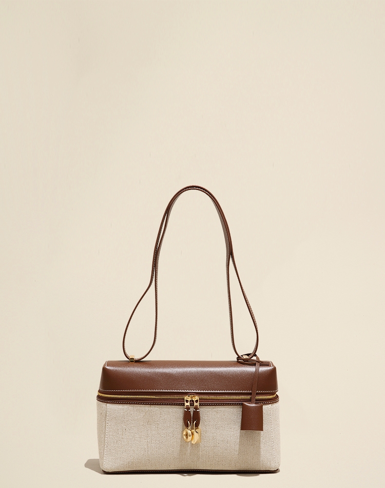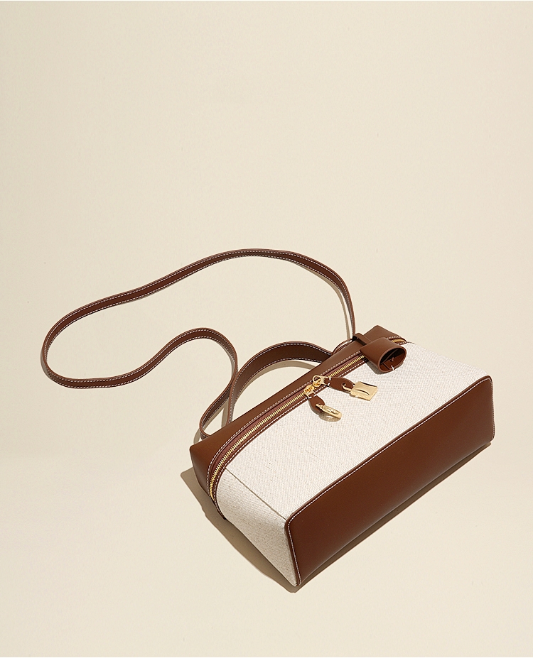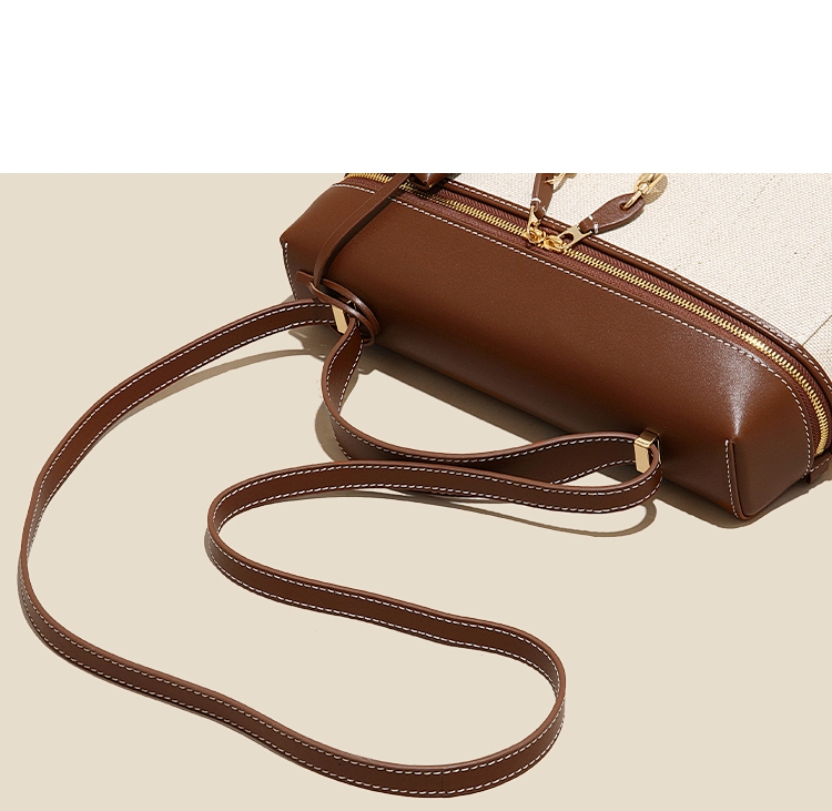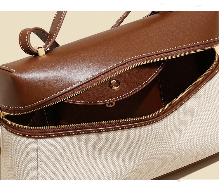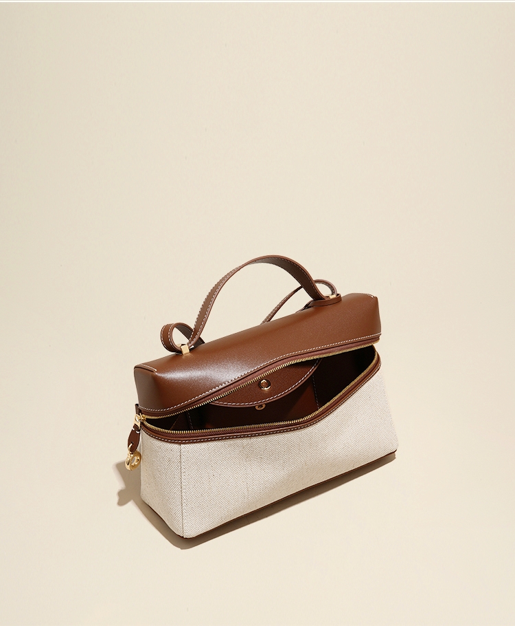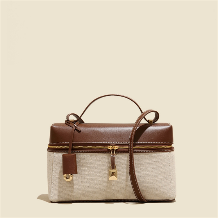 TOUCH MISS法式真皮拼帆布手提饭盒包包女2025新款时尚百搭斜挎包